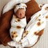 Our Snuggle Hunny organic cotton jersey wrap with matching topknot is soft, snuggly and stretches with baby. This wrap features our exclusive Snuggle Hunny Sunflower design and is made with GOTS Certified Organic Cotton CU 1182228.